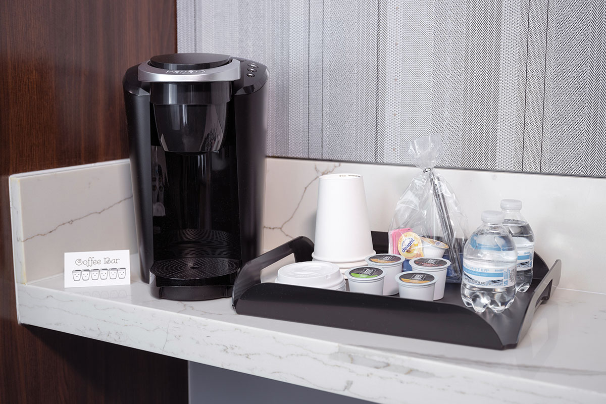 - Stainless steel mini fridge with complimentary refreshments and snacks, plus an in-room coffee station