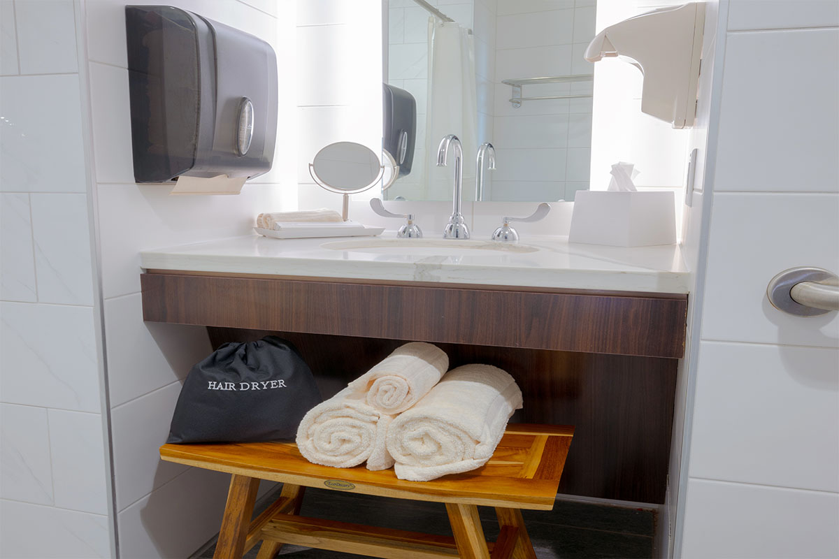 - 450+ square foot suite featuring additional relaxation space for guests, adjustable room lighting, and a 72” flat screen TV with cable and Wi-Fi access.