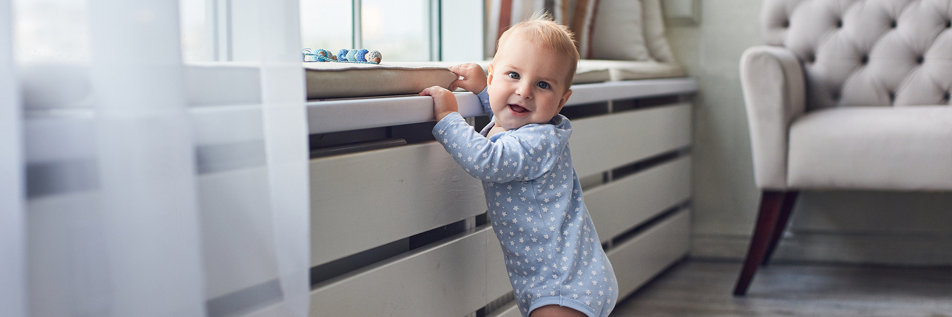 - May crawl or scoot; may try to stand by pulling up on furniture