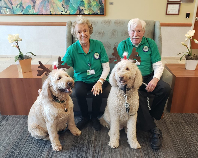 Therapy dogs at Texas Health Hospital Frisco really get into the holiday spirit. One pet even helped decorate the Christmas trees.